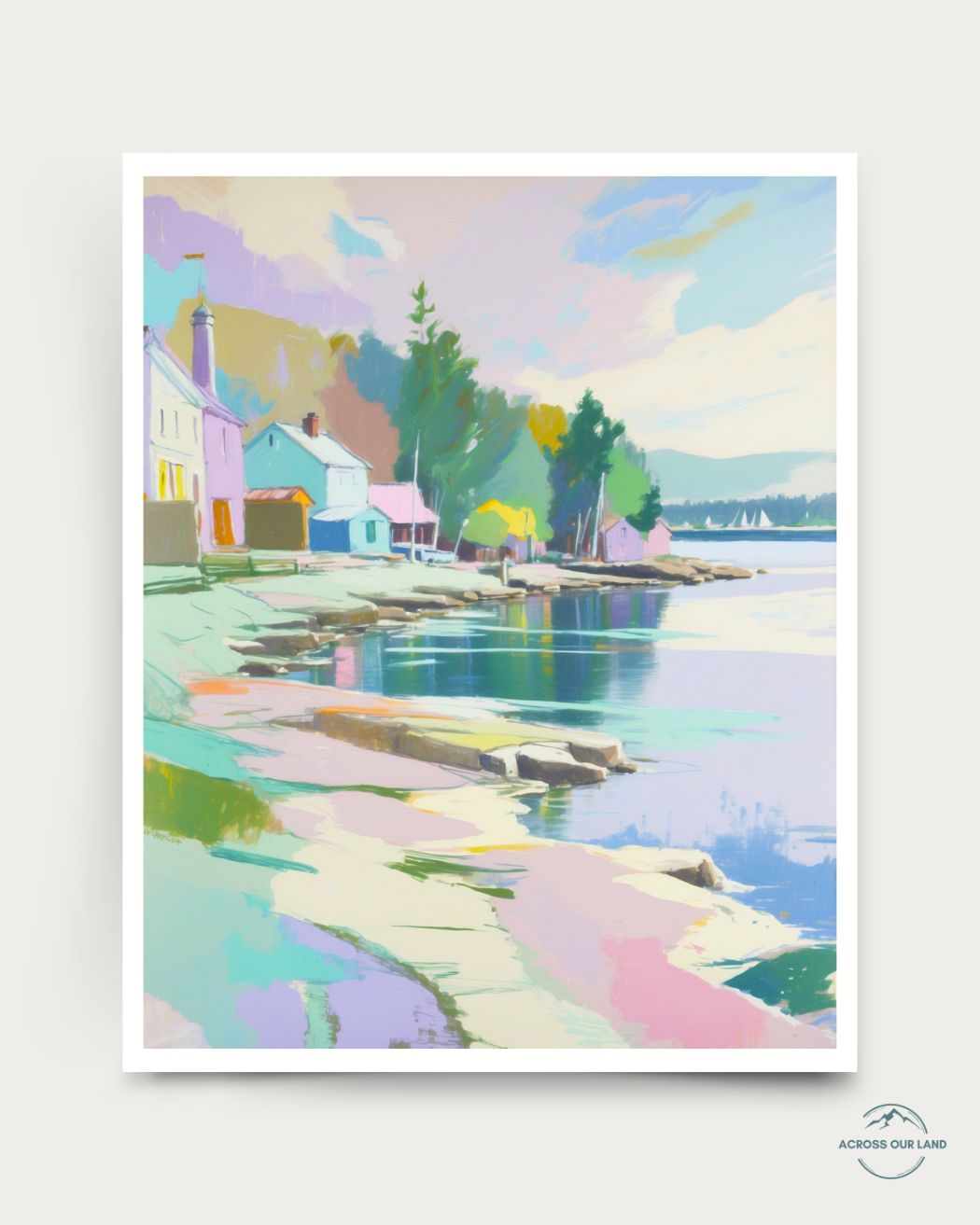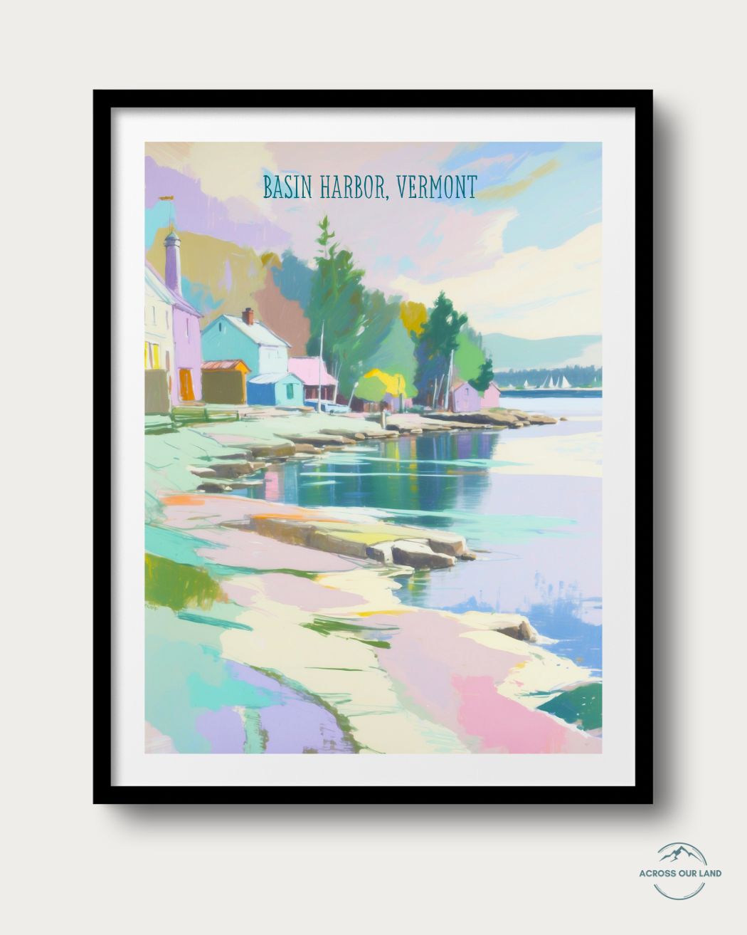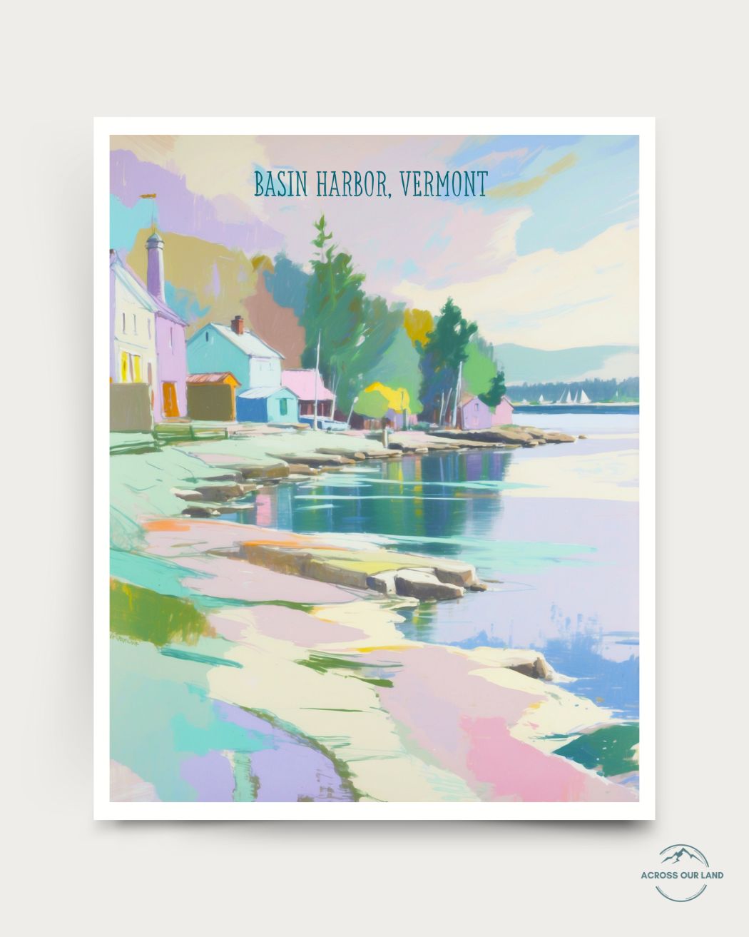 This is an archival print of Basin Harbor, Vermont illustration by Julie Chi- part of Across Our Land series. This series explores American iconic landscapes with bright, happy colors, capturing the magic of nature in a painterly and uplifting way.