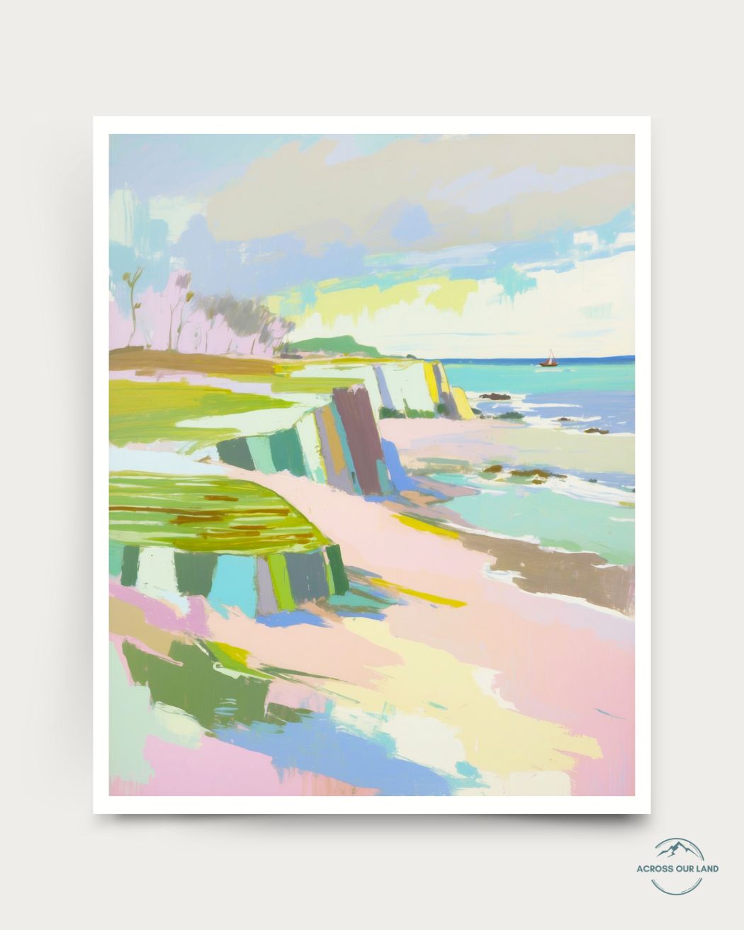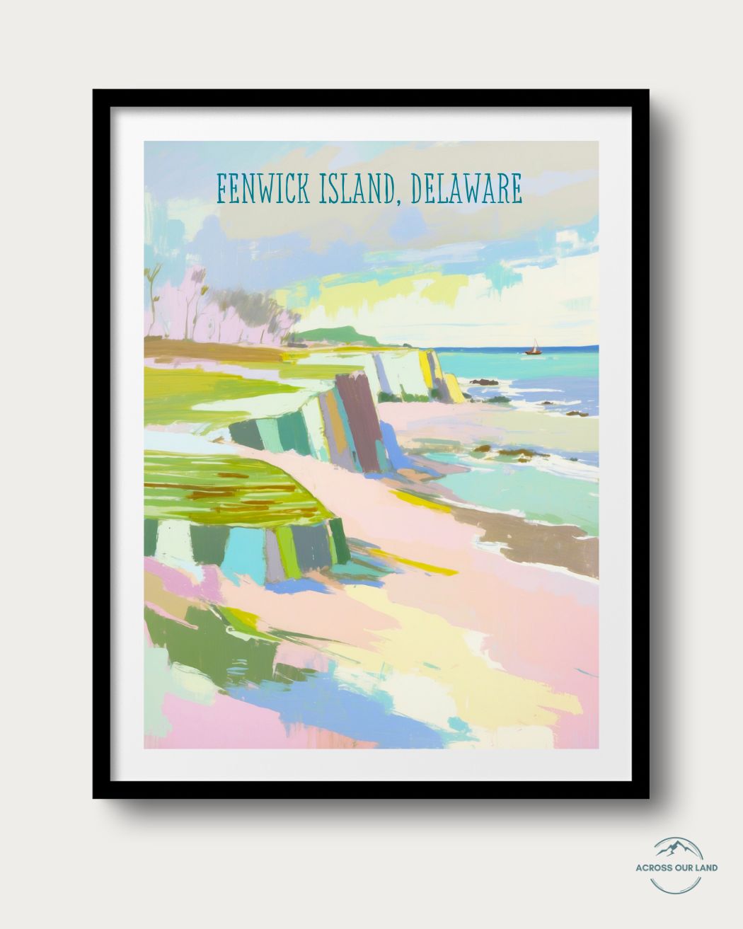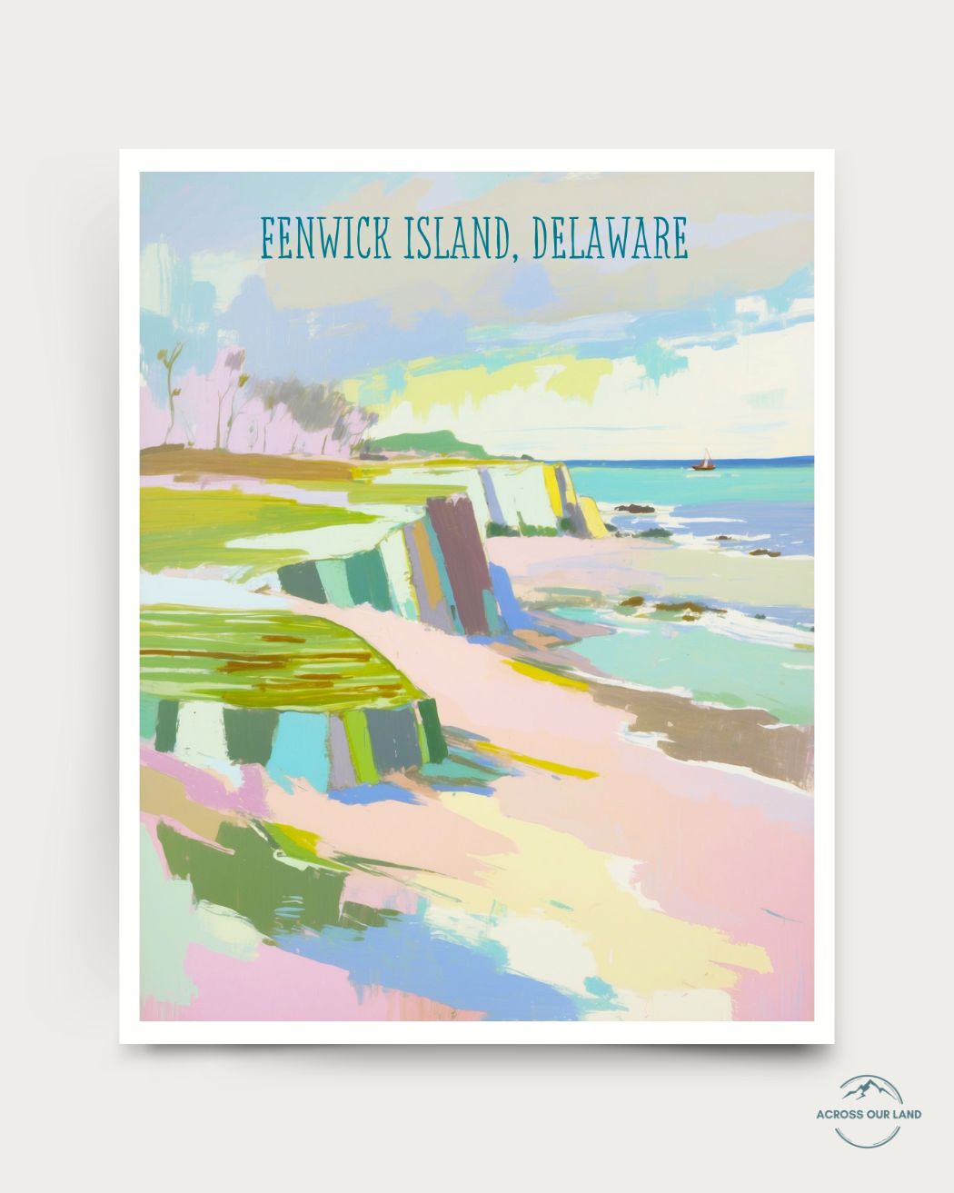 This is an archival print of Fenwick Island, Delaware illustration by Julie Chi- part of Across Our Land series. This series explores American iconic landscapes with bright, happy colors, capturing the magic of nature in a painterly and uplifting way.