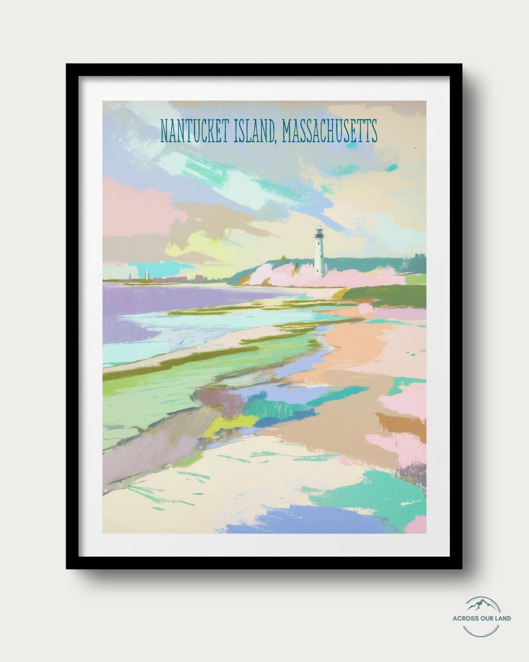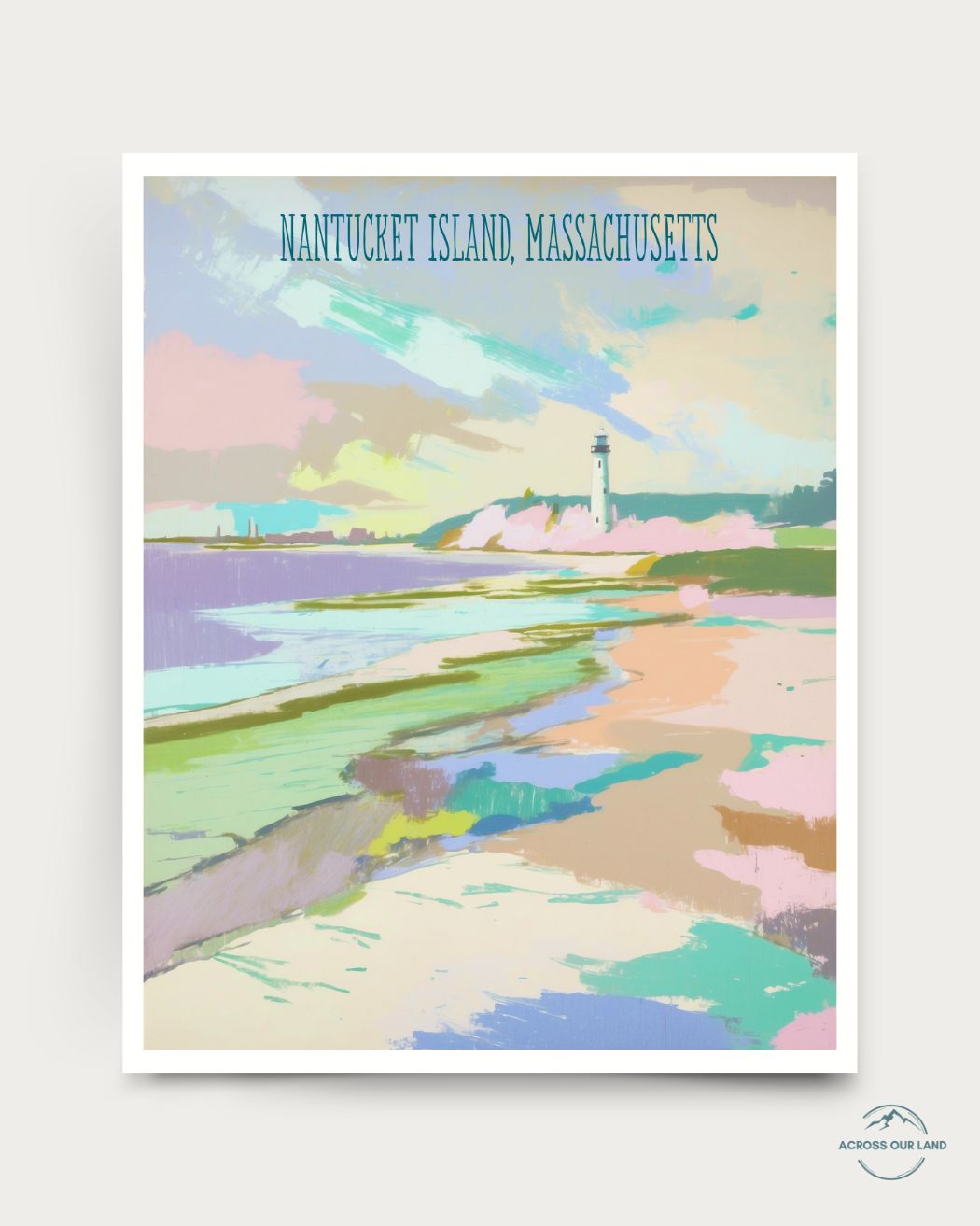 This is an archival print of Nantucket Island, Massachusetts illustration by Julie Chi- part of Across Our Land series. This series explores American iconic landscapes with bright, happy colors, capturing the magic of nature in a painterly and uplifting way.