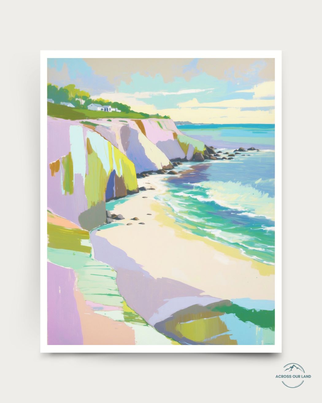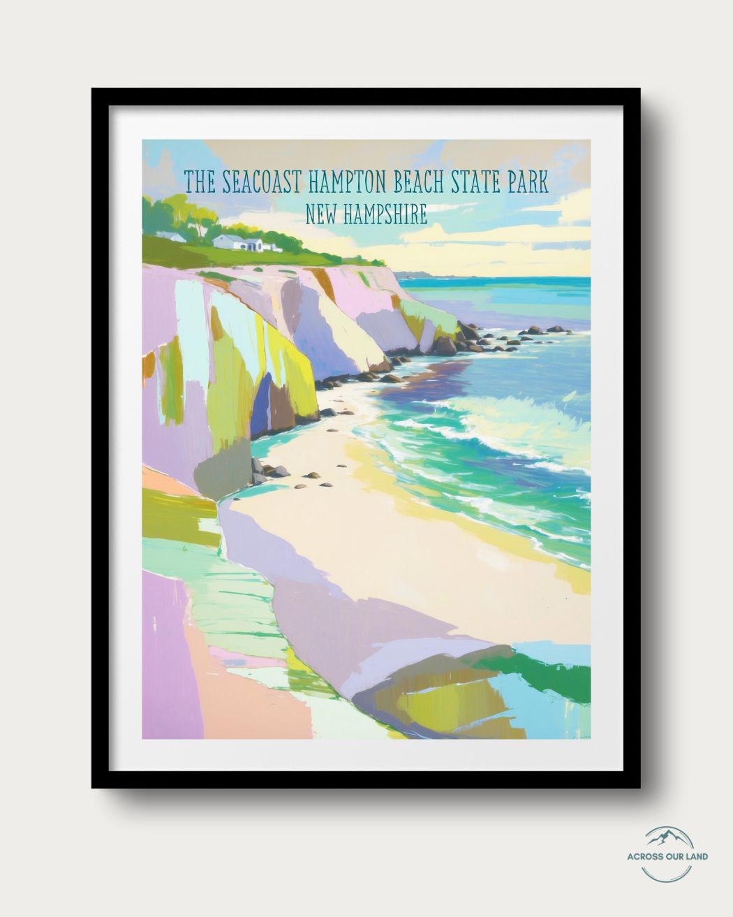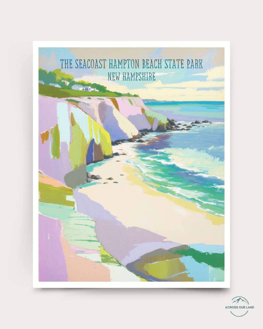 This is an archival print of The Seacoast Hampton Beach State Park, New Hampshire illustration by Julie Chi- part of Across Our Land series. This series explores American iconic landscapes with bright, happy colors, capturing the magic of nature in a painterly and uplifting way.